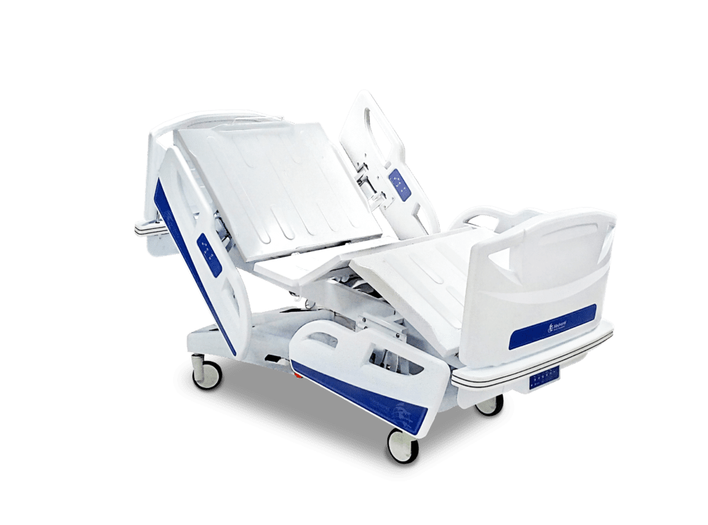 MOVIMENTOS: cárdico, elevação, fowler, flexão, próclive, semi-fowler, sentado, trendelemburg total e CPR total, acionados através de quatro atuadores lineares elétricos por comandos de membrana embutidos nas grades e supervisor na peseira da cama;