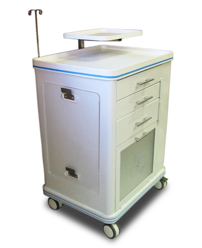 - Três gavetas com puxadores em inox, sendo a primeira com bandeja plástica com divisórias para medicamentos;
